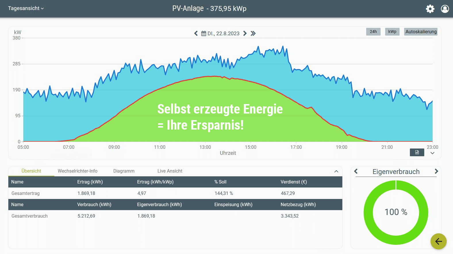 Nutzen Sie die Vorteile der Solarenergie für Ihr Unternehmen! Mit Photovoltaik können Sie Ihre Stromkosten erheblich senken. Besonders profitabel ist die Nutzung von Solarstrom durch Eigenverbrauch. Während des Tages, wenn Ihre Photovoltaikanlage den meisten Strom produziert, läuft auch Ihr Betrieb auf Hochtouren. Maschinen und Infrastruktur verbrauchen den erzeugten Strom genau dann, wenn er verfügbar ist. Das ermöglicht meist eine beeindruckende Eigenverbrauchsquote von bis zu 70% oder mehr.